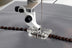 - Pod patku umístěte 4 mm perly na šňůrce a položte je do drážky na spodní straně mini patky. Pod látku umístěte stabilizátor. Spusťte přítlačnou patku. Otáčejte ručním kolem a opatrně udělejte několik stehů rukou. Nejprve prošijte perly na kousku látky, abyste vyzkoušeli napětí nitě, přítlak přítlačné patky, délku a šířku stehu podle perlí. V případě potřeby proveďte úpravy. Šijte pomalu. (U některých stehů může být nutné upravit délku stehu během šití nebo steh naprogramovat, aby byl výsledek co nejlepší).