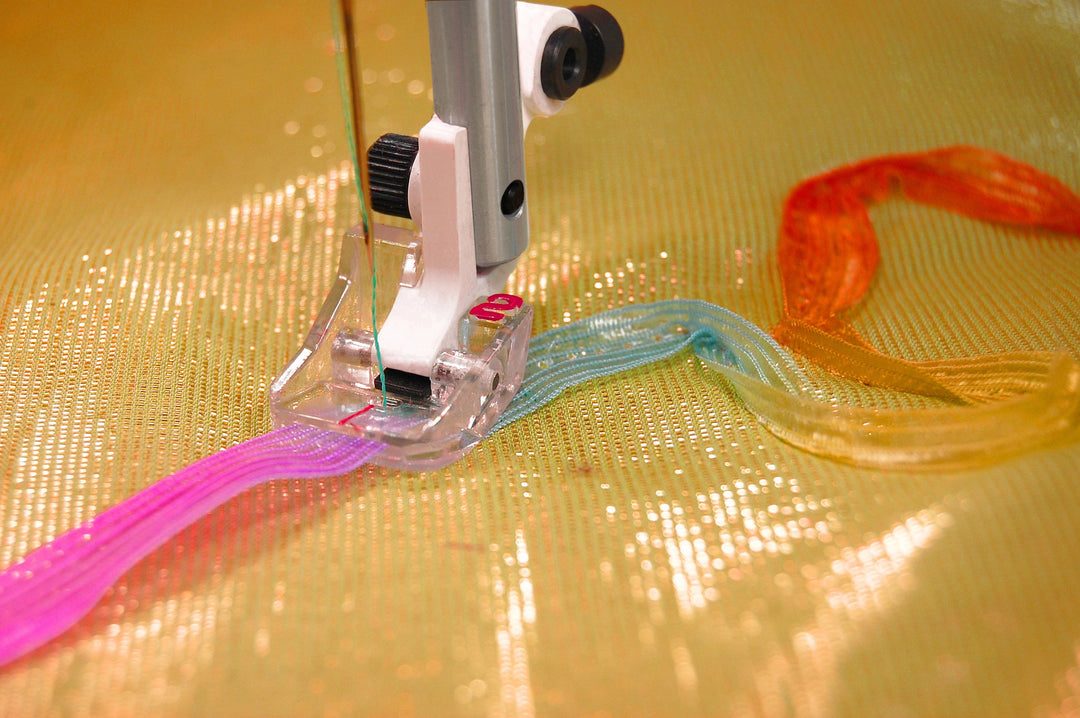 Vælg farvebåndsfod 1, 2 eller 3 afhængigt af bredden på dit farvebånd. For at opnå det bedste resultat skal båndet fylde åbningen i foden og stadig løbe let igennem den. Vi anbefaler, at du bruger bånd med en jævn tykkelse.