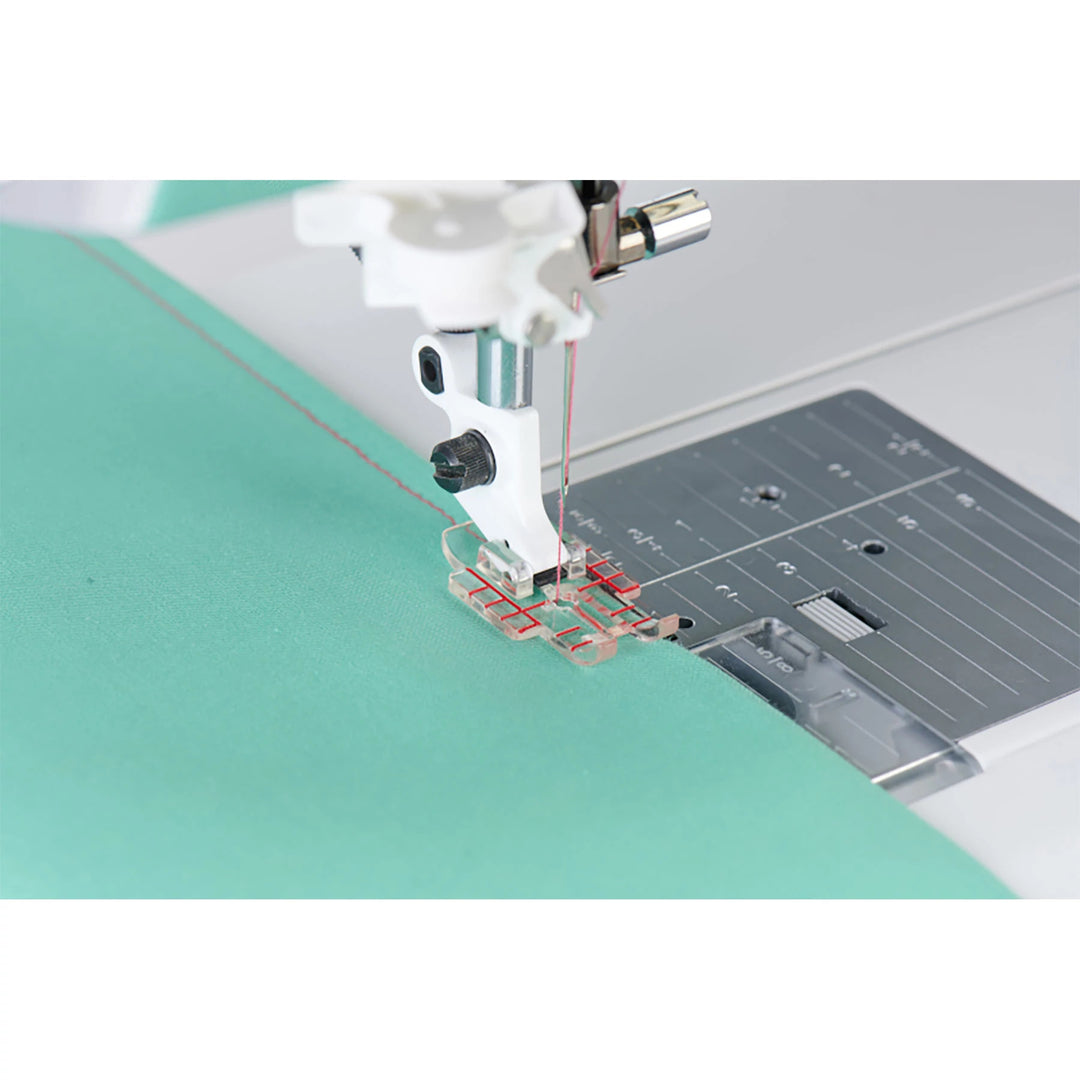 - Der klare ¼"-Nähfuß hat rote Markierungen auf dem Fuß. Sie helfen Ihnen, den Stoff zu Beginn des Nähens, an den Ecken und am Ende des Stoffes auszurichten.