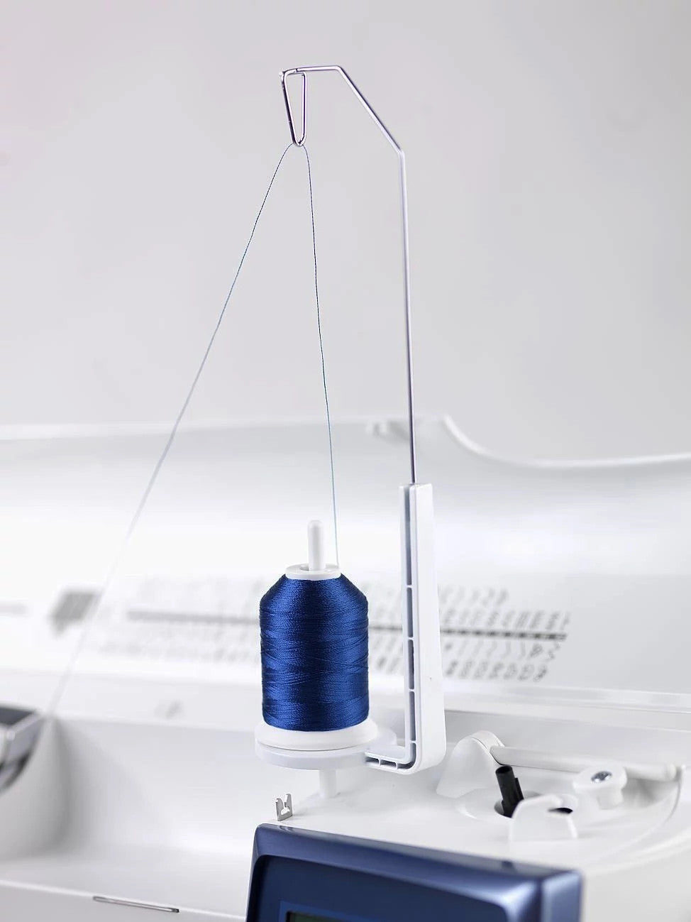 Der Mega Spool Stand ist ein Zubehörteil, das die Verwendung großer Spulen mit Ziergarn erleichtert. Der Ständer wird oben auf die Nähmaschine montiert und umfasst den eigentlichen Fadenständer, eine Fadenführung und ein Fadennetz.