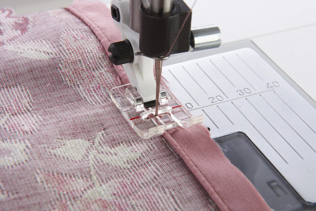 9. Legen Sie die Stoff- und Paspellagen unter den Mini-Paspelfuß, wobei sich die Paspel in der Rille an der Unterseite des Fußes befindet. Nähen Sie. Die Rille an der Unterseite des Fußes führt die Paspel beim Nähen.