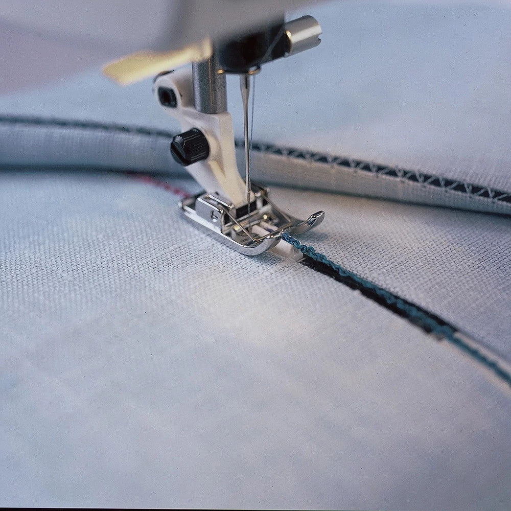 Start with a long thread tail of both top and bobbin thread. Hold these threads as you begin sewing until the needle catches on the fabric. Because of the nature of the stitching, it will stitch on “air” for several stitches before it goes over and catches the fabric edge. Once the needle has caught the fabric, you can let go of the threads. Sew, holding the edges gently together in front of the foot.